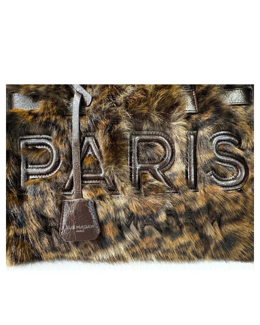 Tote Bag in ecopelliccia animalier con logo PARIS, manici e dettagli in Naplak. Soffietti laterali e chiusura con zip. Tracolla removibile e fodera interna in cotone con tasca. L 37 H 26 P 18