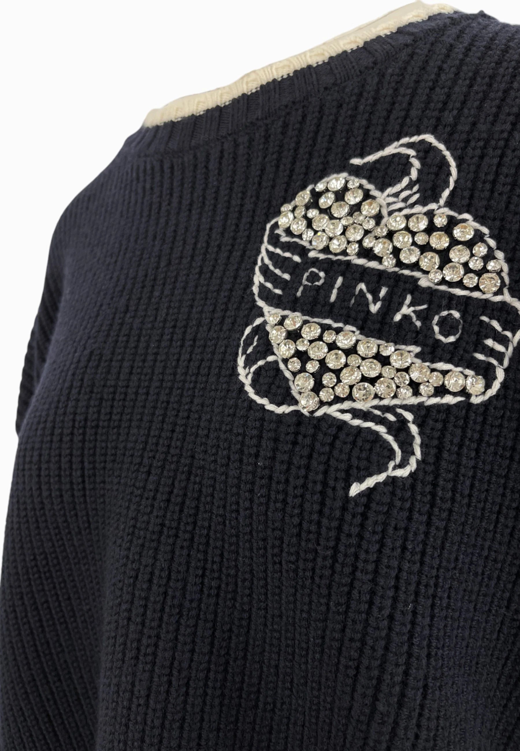Maglia girocollo in 100% lana, vestibilità over, con dettagli a contrasto bianchi e logo ricamato con strass. Elegante, confortevole e perfetta per un look casual-chic.