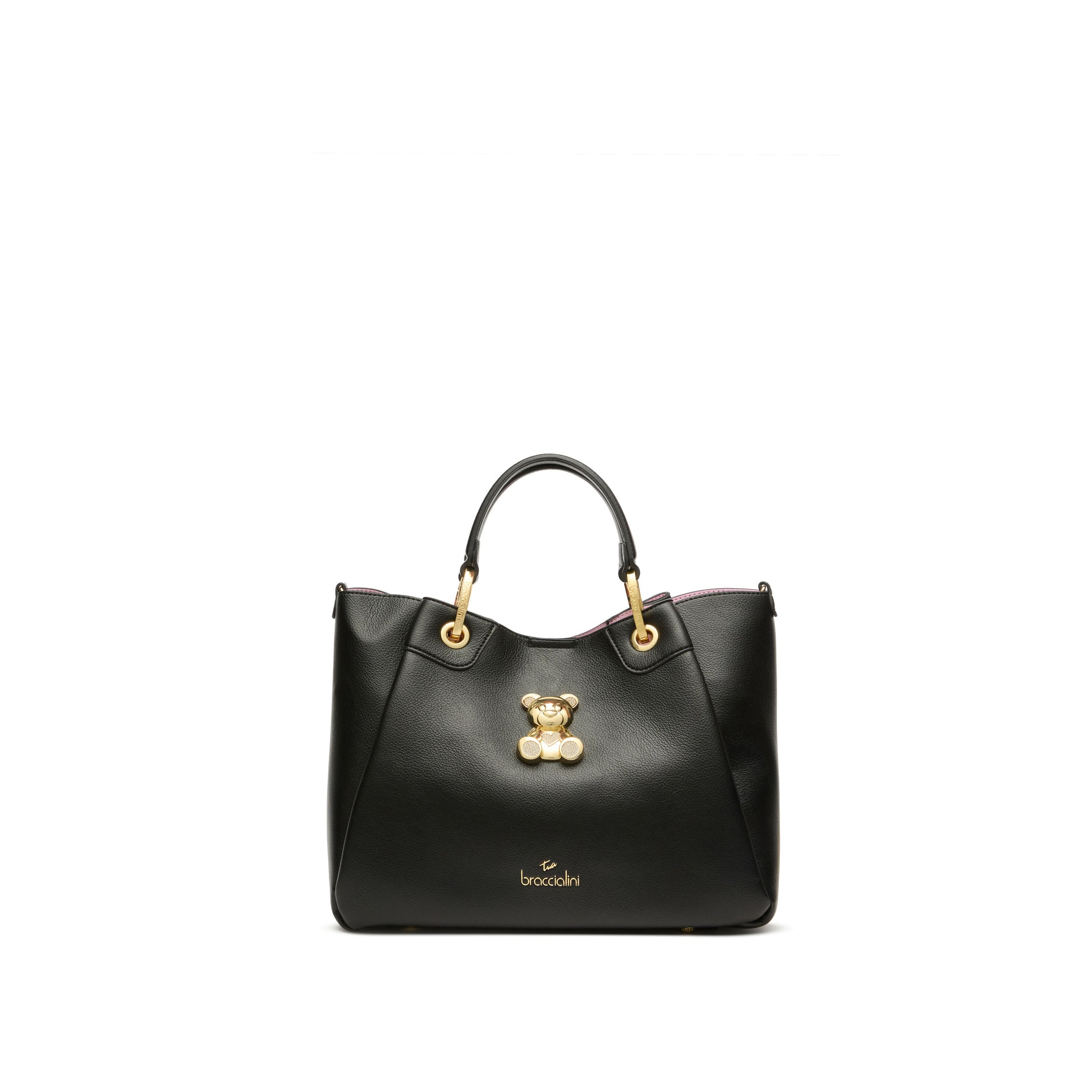 Borsa a mano di grandi dimensioni con doppi manici, nasconde tra le cuciture trasversali dei pannelli che permettono di ampliarla. La borsa è in similpelle , si distingue per il dettaglio di un orsetto dorato impreziosito da applicazioni scintillanti, che donano un tocco di luce e raffinatezza al design. All'interno della borsa una pochette estraibile e una tracolla in nastro logato removibile e regolabile che ne permette la doppia portabilità.