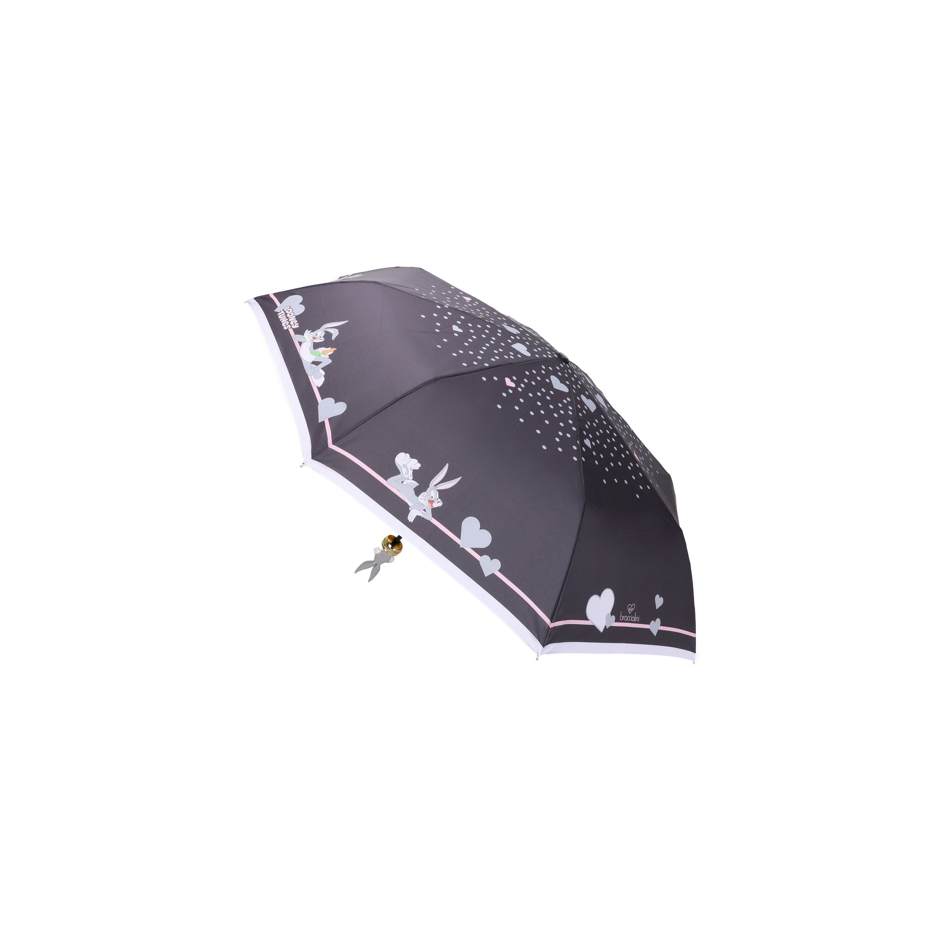 Ombrello manuale con manico sagomato a forma di Tweety smaltato. Il tessuto marrone e rosa è decorato con una pioggia di foglie e l’iconico canarino Looney Tunes. Un accessorio ironico e irresistibile.