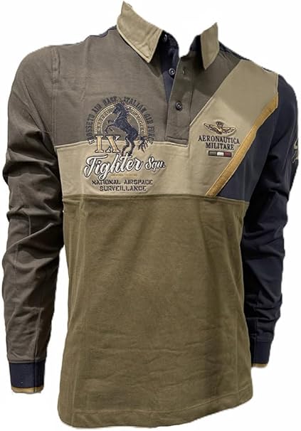 Polo Aeronautica Militare da uomo a maniche lunghe in cotone jersey con ricami dedicati all'Aeronautica Militare. Inserti di diversi colori e diversi tissuti, per un massimo comfort e vestibilità. Composizione: tessuto principale 100% cotone. Tessuto secondario: 95% cotone, 5% elastan. - La taglia L ha una lunghezza di 71 cm, spalla di 45 cm, torace di 53,5 cm e maniche di 67 cm. VESTIBILITÀ: Regolare